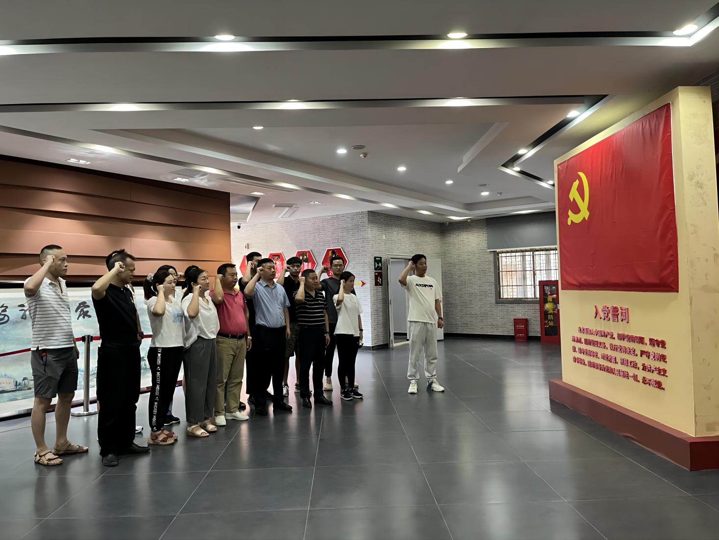 天朗氣清,惠風和暢。在8月5日上午十點,全體黨員同志、入黨積極分子代表來到武漢抗戰第一村---姚家山新四軍第五師舊址紅色教育基地。面對鮮紅的黨旗,黨員們一起重溫入黨誓詞。“我志愿加入中國共產黨,擁護黨的綱領,遵守黨的章程……永不叛黨?!卞P錚誓言響徹大地。重溫入黨誓詞,既是是初心使命的再宣示、更是接續奮斗的再出發。